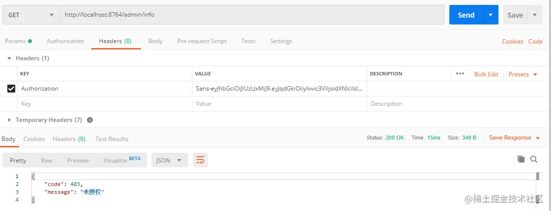 访问USER角色的接口,把上一步获取到的Token设置在Headers中,Key为Authorization,我们之前实现的JWTAuthenticationTokenFilter拦截器会根据请求头中的Authorization获取并解析Token